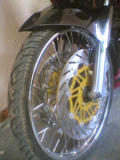 Bagi anda pecinta modifikasi pasti tahu racun yang satu ini. Salah satu variasi motor pada bagian kaki-kaki menggunakan sistem pengereman double disk atau cakram ganda pada velg depan. bebarapa velg atau tromol sudah menyediakan sistem ini . tapi sangat susah mencari velg dan tromol yang sudah menggunakan sistem double disk ini. untuk mengakalinya kamu bisa lho membuat sendiri doubel disk pastinya dengan harga yang terjangkau.
